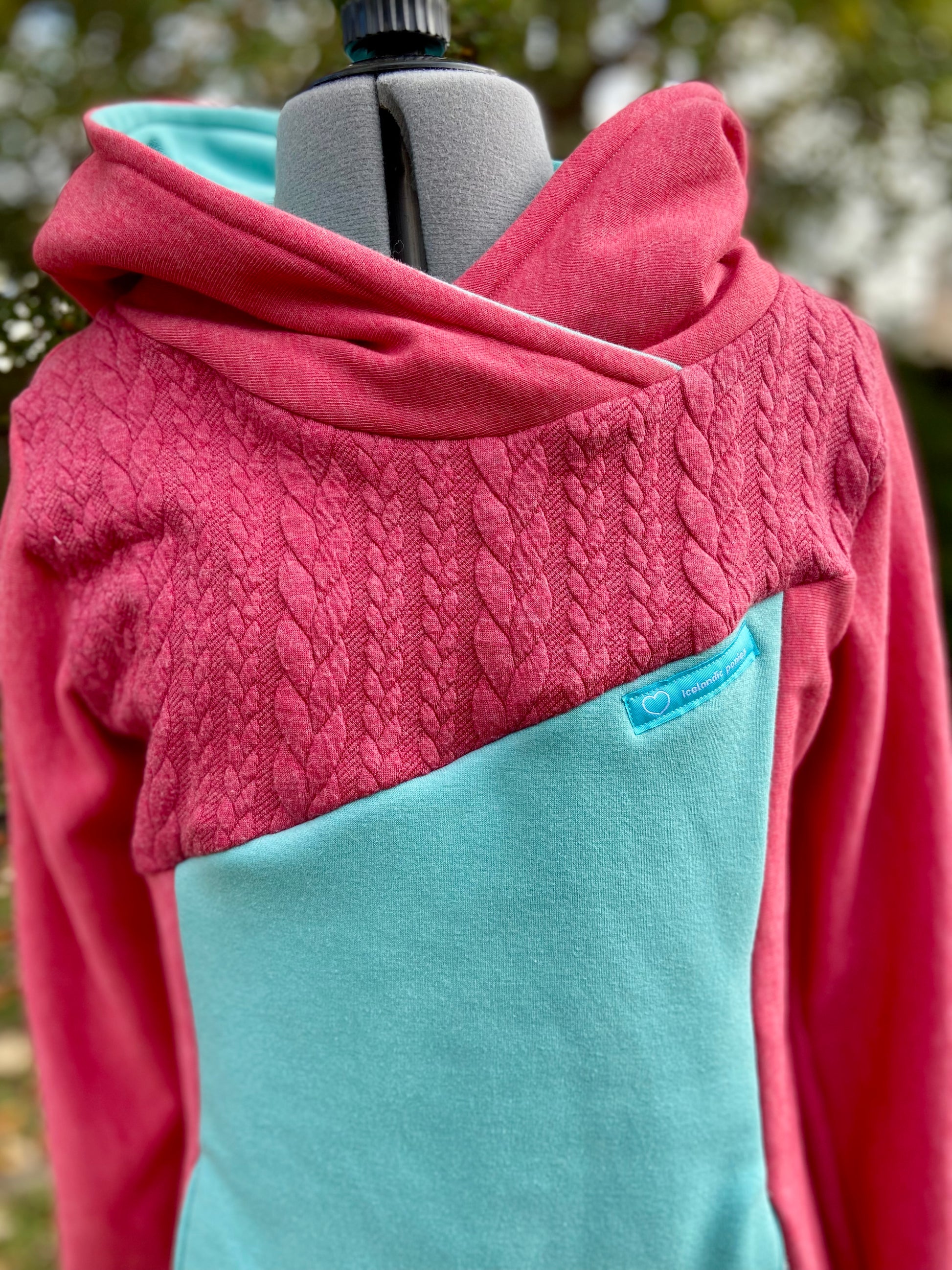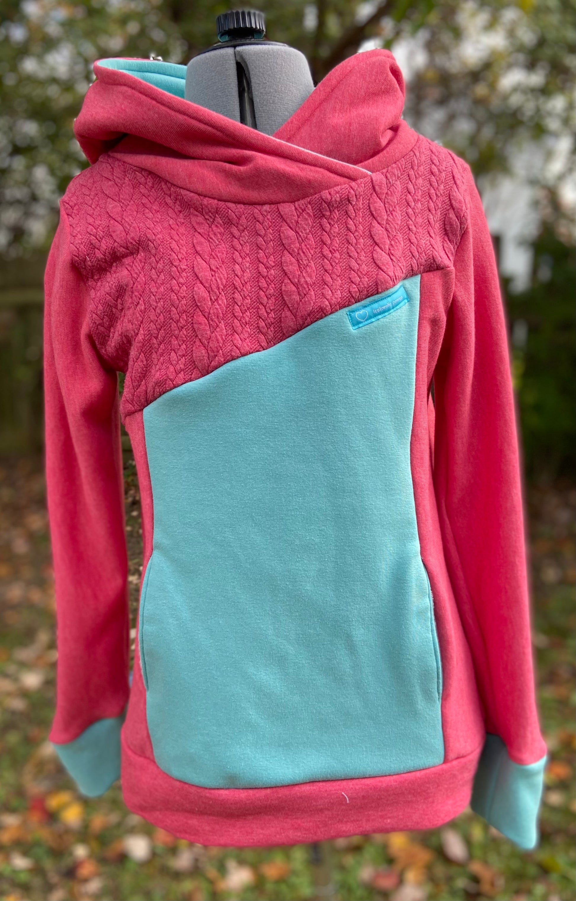 This color combination is one of my favorites. Bright pink main fabric, ice blue belly and hood interior. Blue cuffs. The pink fabric is discontinued from my supplier, so this is the only one like this. Made of super soft fabrics. One large kangaroo pocket with very soft furry interior.